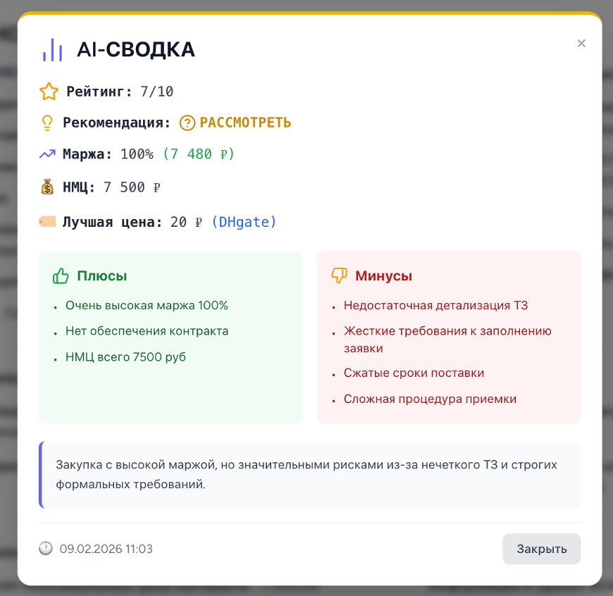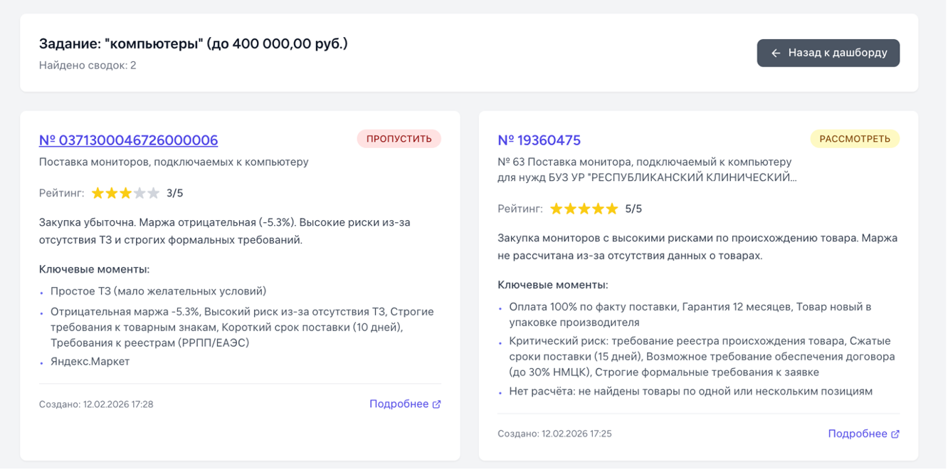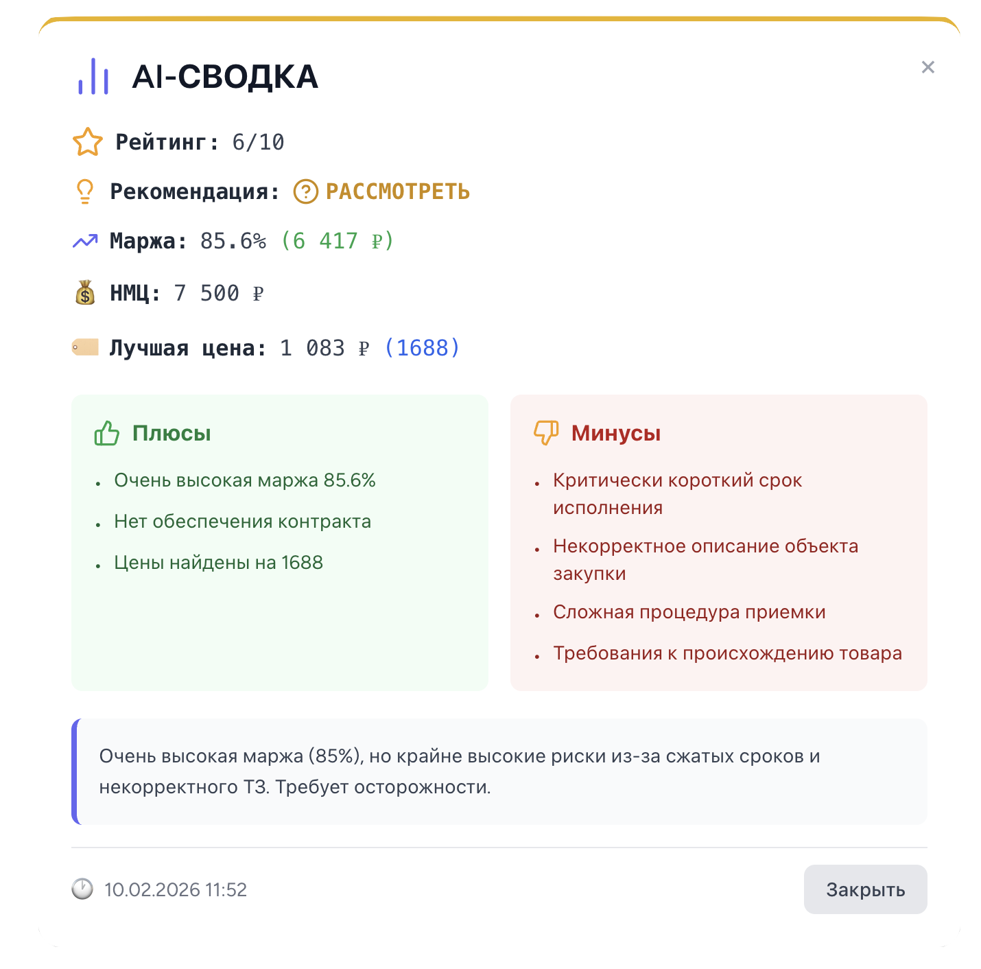 Рейтинг, маржа и рекомендация «рассмотреть» или «пропустить» — сразу видно, куда подавать заявку, а куда не тратить силы.
