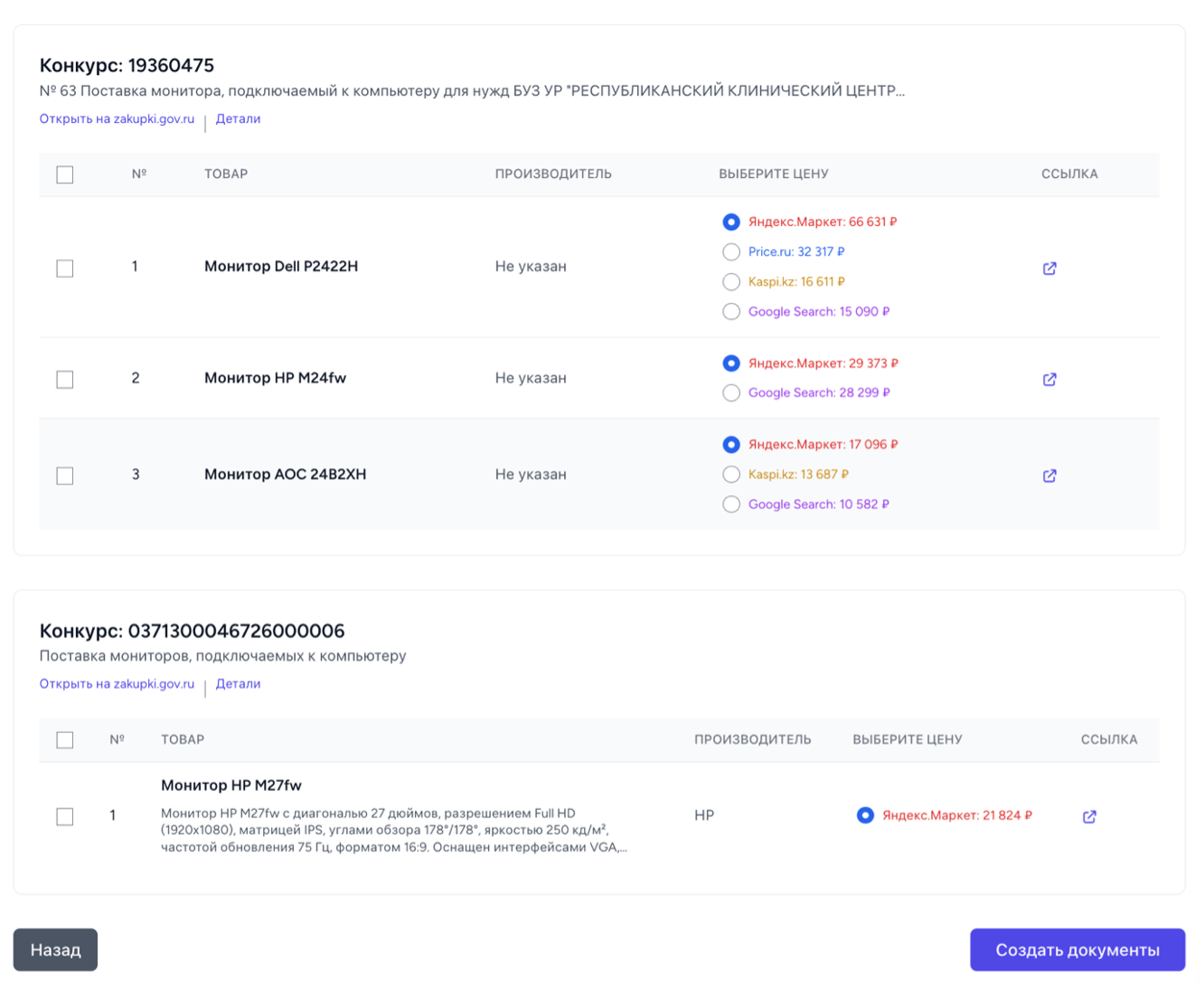 НМЦ, лучшие цены с маркетплейсов, расчёт маржи — в одном экране. Решайте, есть ли смысл участвовать.