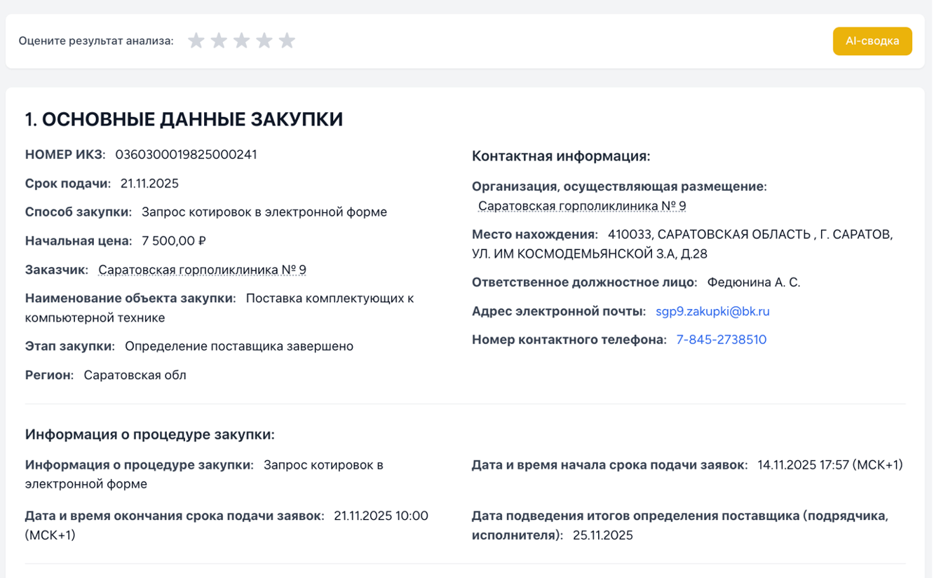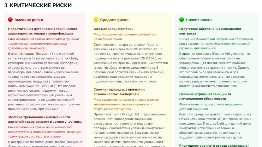 Договорённые закупки, нечёткое ТЗ, жёсткие сроки и сложные процедуры — всё отмечено в AI-сводке. Не участвуйте впустую.
