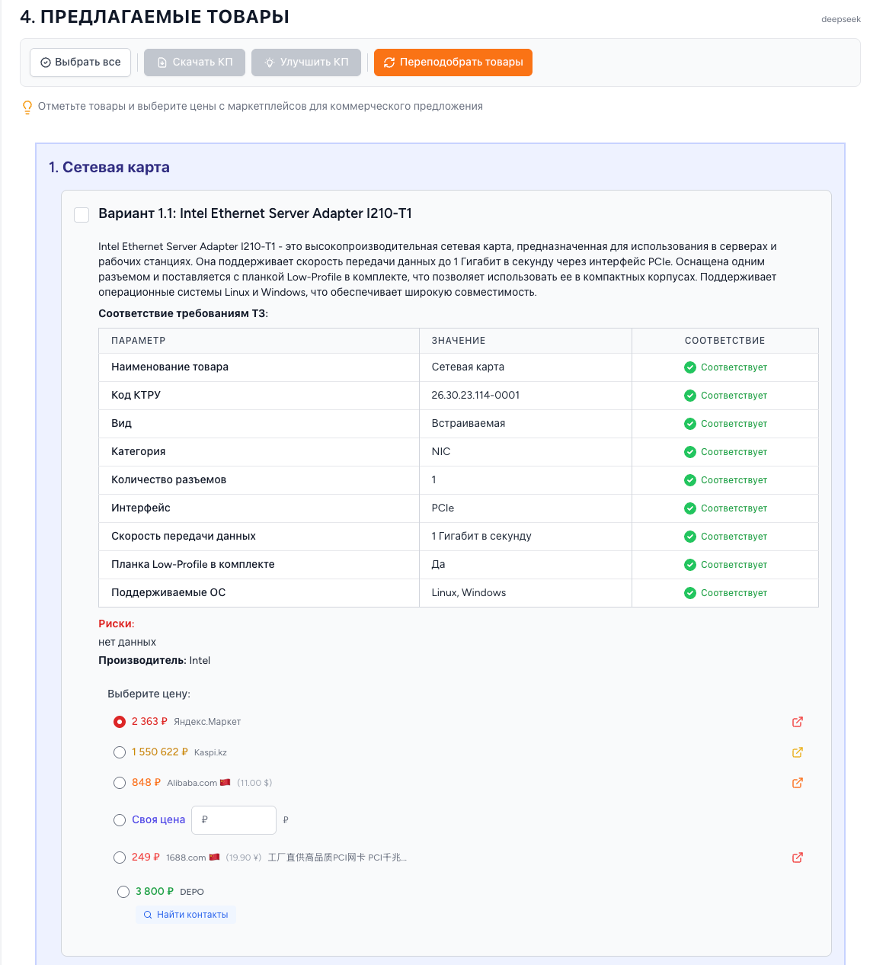 Система автоматически определяет оборудование, находит цены и оценивает риски участия.