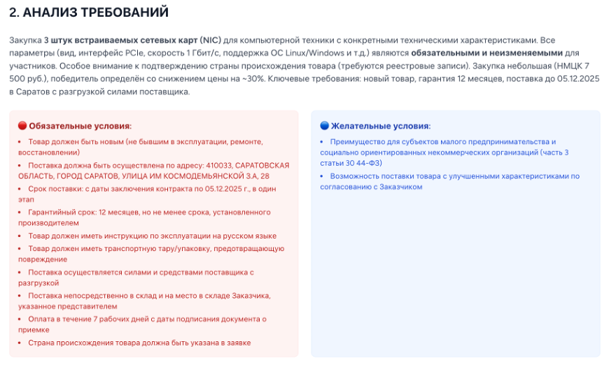 Риски, сроки, требования к заявке — AI собрал всё в структурированном виде. Никаких сотен страниц ТЗ.