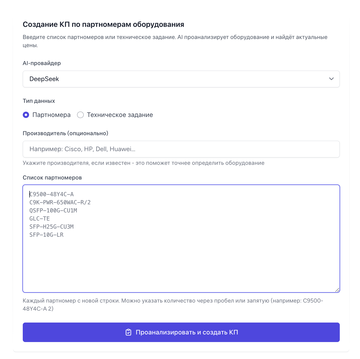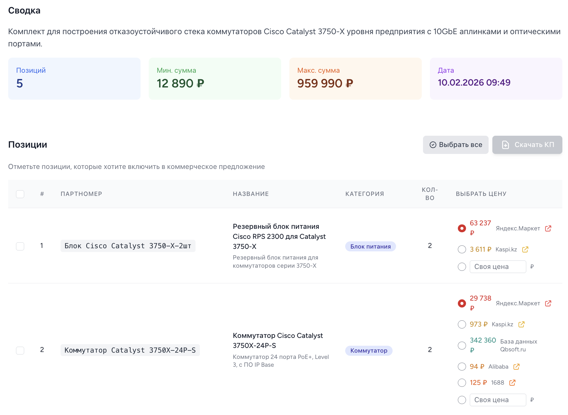 Сервис автоматически определяет оборудование по партномерам и находит актуальные цены на маркетплейсах. Вы получаете готовое коммерческое предложение с позициями и ценами с Яндекс.Маркета, Kaspi.kz, Alibaba и других площадок.