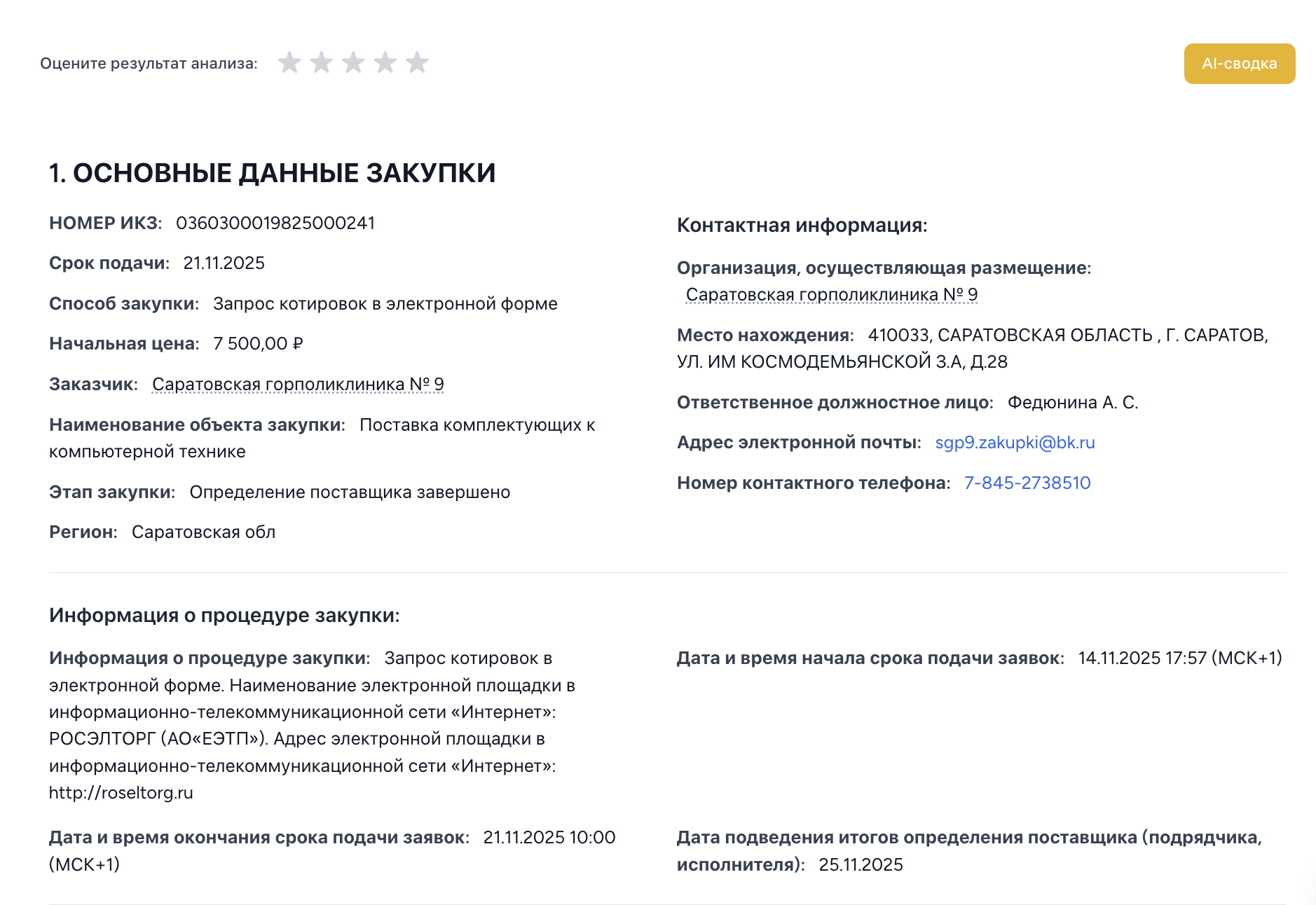 - Рейтинг привлекательности для каждой закупки